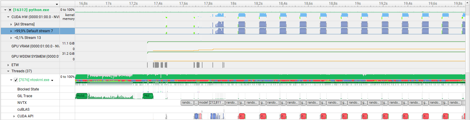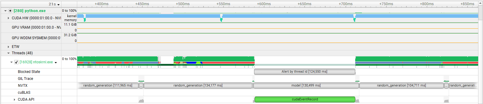 In the asynchronous case, model execution and random data generation overlap. The CPU and GPU work in parallel. However, as suspected, the GPU occasionally pauses during data transfers because everything is executed on a single stream. With multiple streams, transfers and computations could occur simultaneously, potentially improving performance (or at least, that’s my guess).