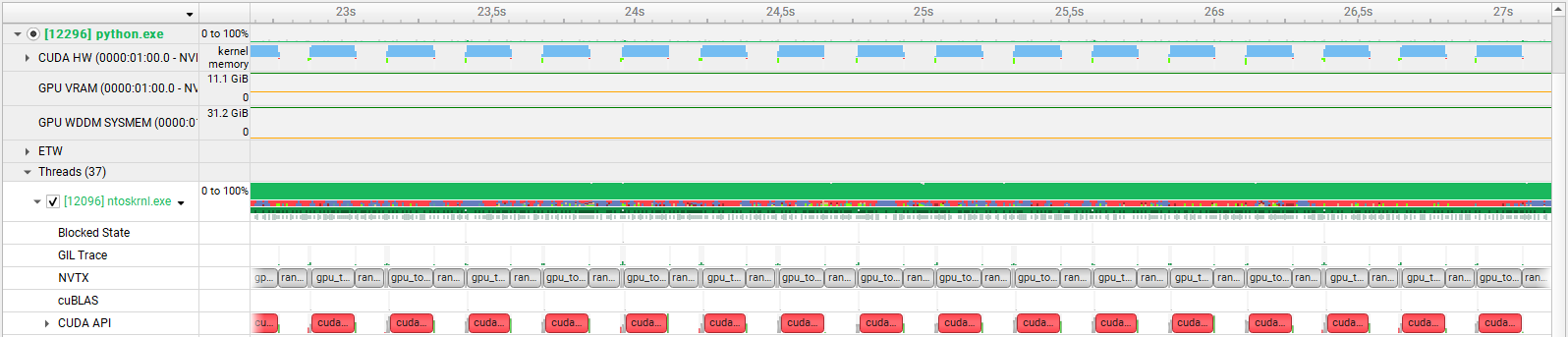 Here, the blocking calls related to data transfers are quite apparent. The CPU waits for the GPU’s results (which will be available at the end of the computation) before proceeding to the next iteration (and re-generating a batch of random data). When looking at a broader view of the execution, it becomes clear that the execution is “choppy.”